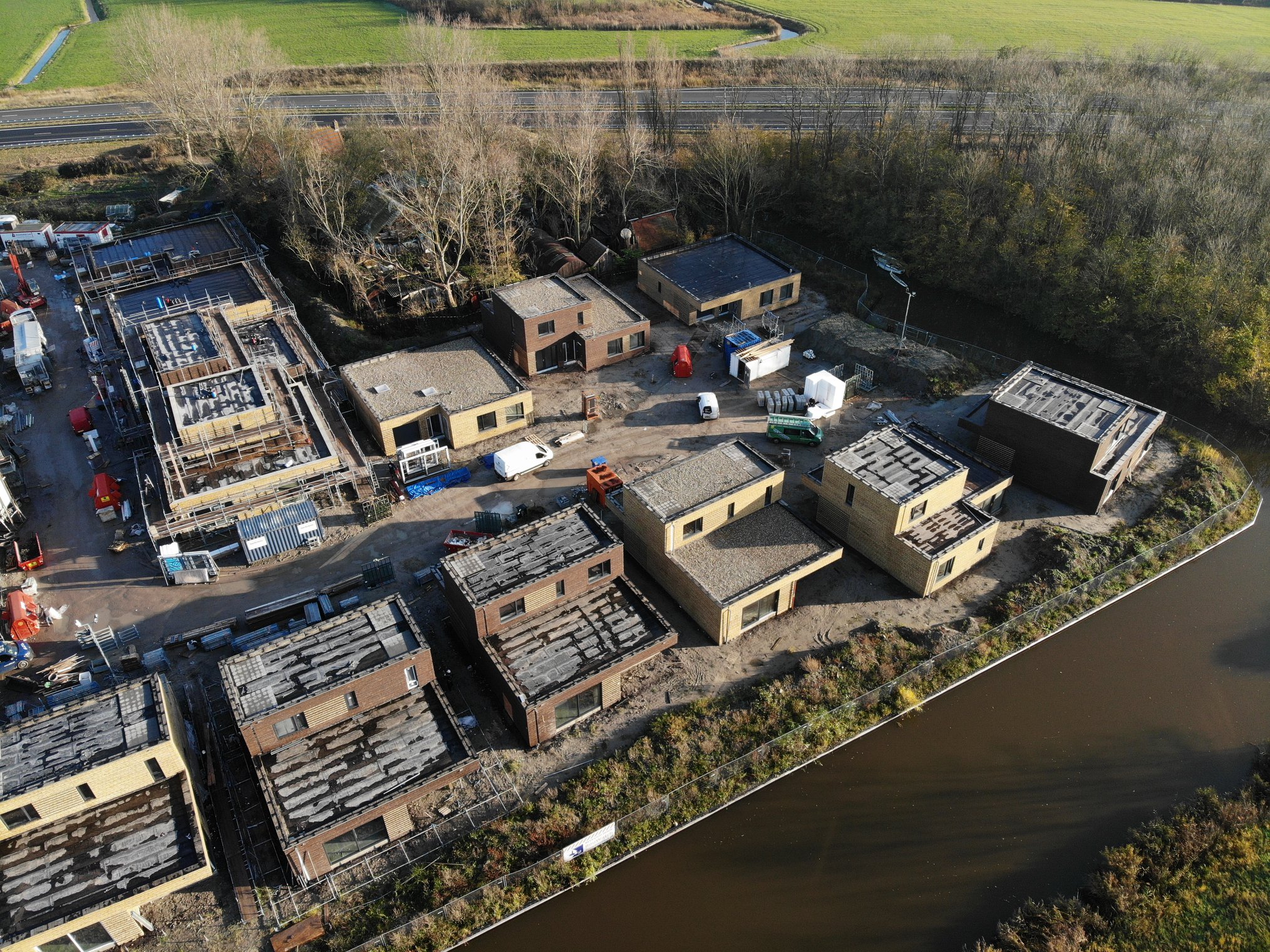 Met gemiddeld twee medewerkers hebben we de werkzaamheden stapsgewijs uitgevoerd. Daarbij brachten we eerst alle dakvloeren aan. Vervolgens bij vier woningen tegelijk de cementdekvloeren en het stukadoorwerk. Zodra alles droog en afgemonteerd was volgde het spack- en pleisterwerk.