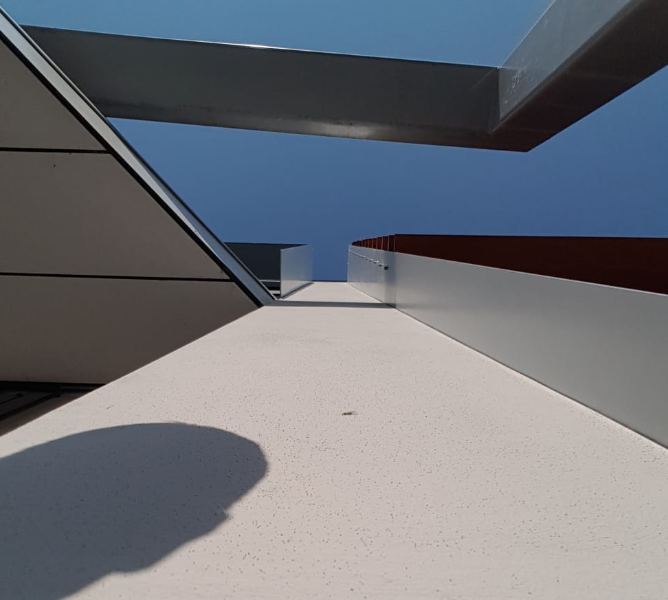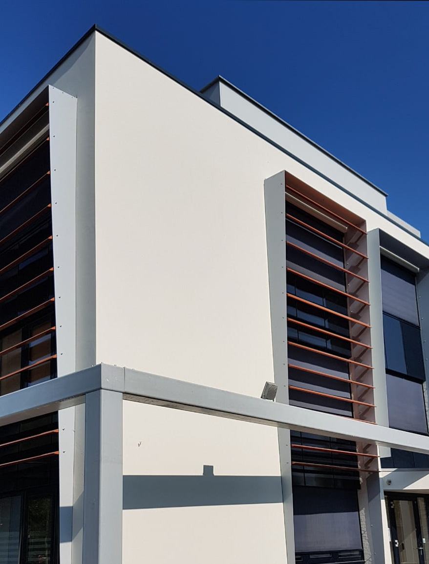 Om te voorkomen dat er water achter het stucwerk kan komen, zijn we zeer nauwkeurig te werk gegaan bij het aanbrengen van de stucstops bij de stalen kolommen. In de gevel zijn stalen voorzieningen geplaatst met daarin lamellen. Deze komen op bepaalde punten tot een halve meter de gevel uit, voor de stukadoors een uitdagend en bewerkelijk onderdeel van deze opdracht. Daarbij kwam het ook aan op tempo, zeker tijdens de warme periode in mei/juni. Om lelijke aanzetten door te snel drogend stucwerk te voorkomen, hebben we gedurende zes weken vier mensen ingezet. Tijdens erg warme dagen hebben we de gevel bovendien extra bevochtigd. Met deze maatregelen en dankzij goed vakmanschap konden we de gevel strak en glad opleveren.